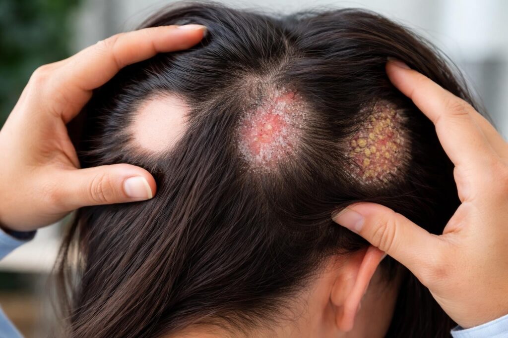 Scalp psoriasis creates raised, scaly patches that can lead to temporary hair loss in affected areas. This chronic inflammatory condition affects roughly 2-3% of the UK population and often extends beyond the hairline to the forehead, neck, and ears.