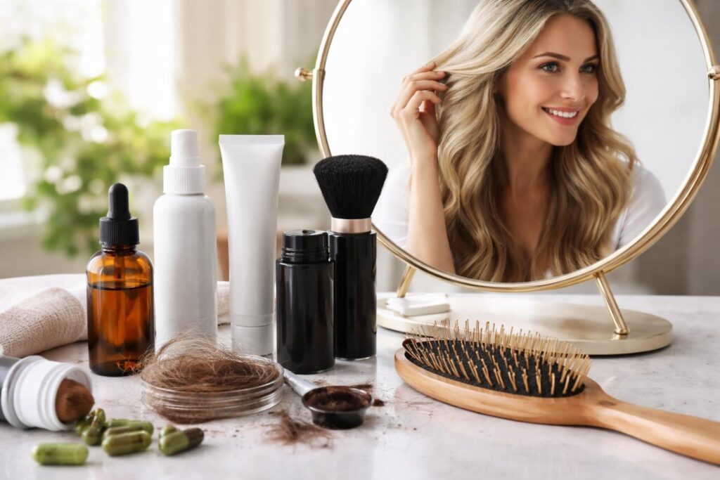 | Keratin Fibres | Shake over thinning areas | Moderate to heavy | Until next wash | Diffuse thinning |